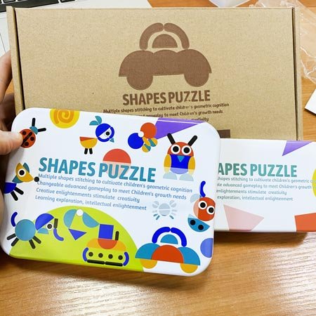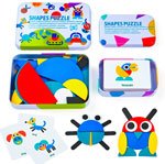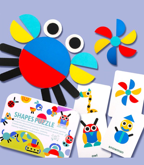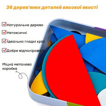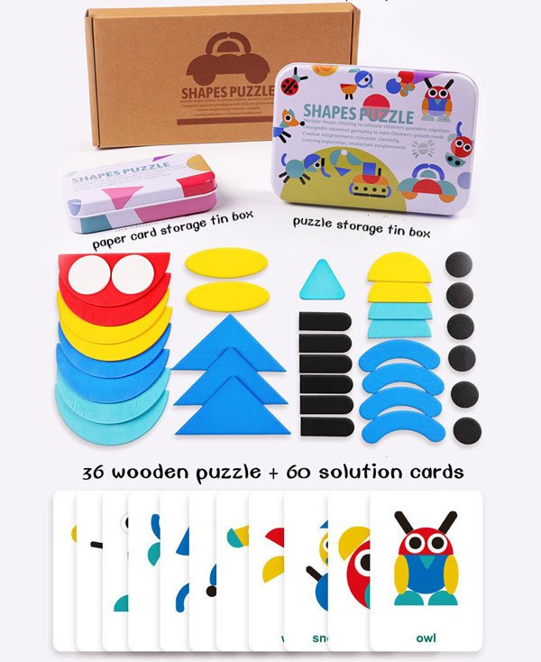 Цей набір пазлів включає 36 предметів різних дерев'яних форм і 60 двосторонніх карток в залізній коробці.
